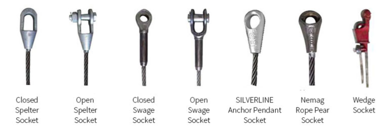 Swage sockets use mechanical compression to secure the wire rope inside a steel or alloy socket.